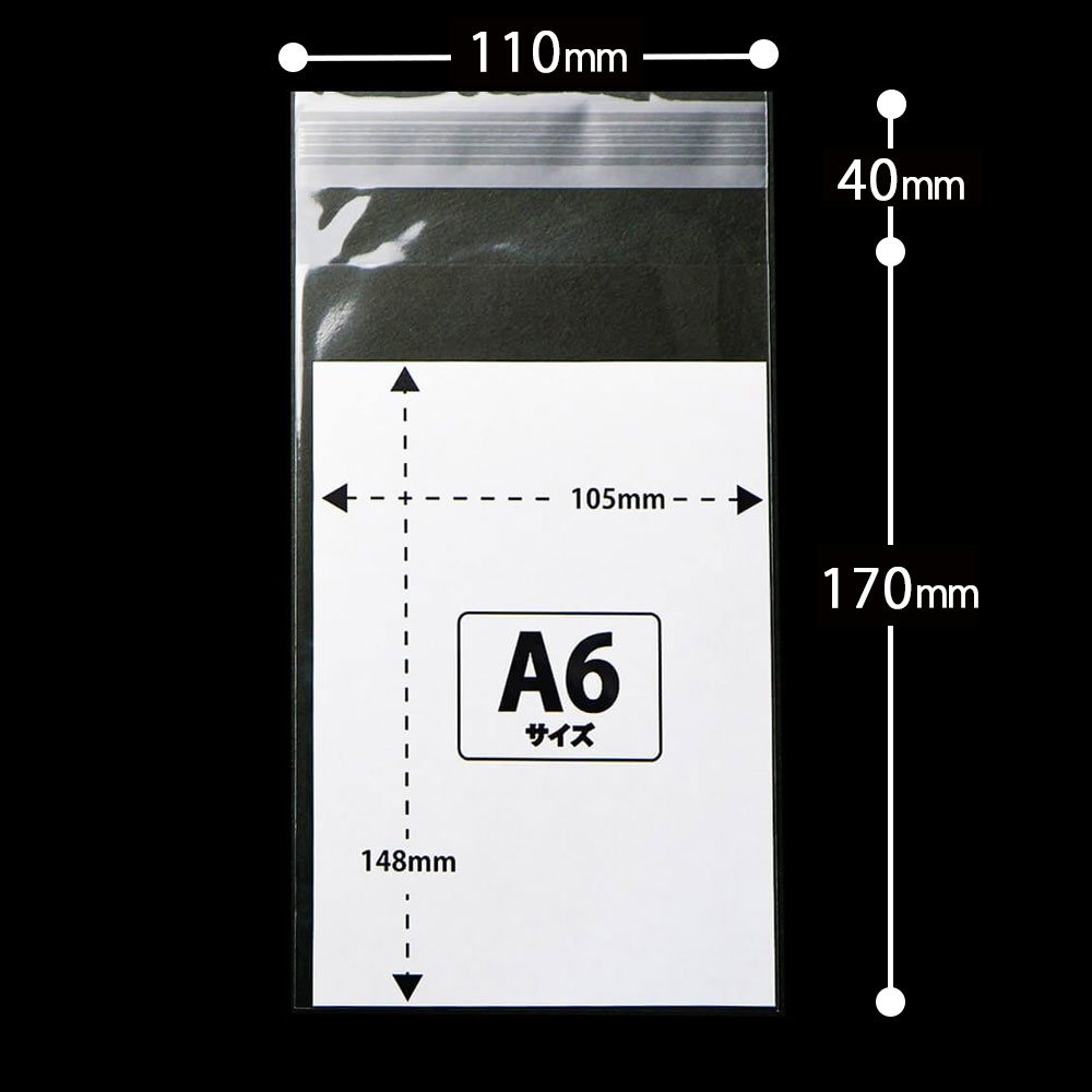 A6サイズのテープ付きOPP袋とは、横110mmx縦170mm+フタ40mmのOPP袋です。