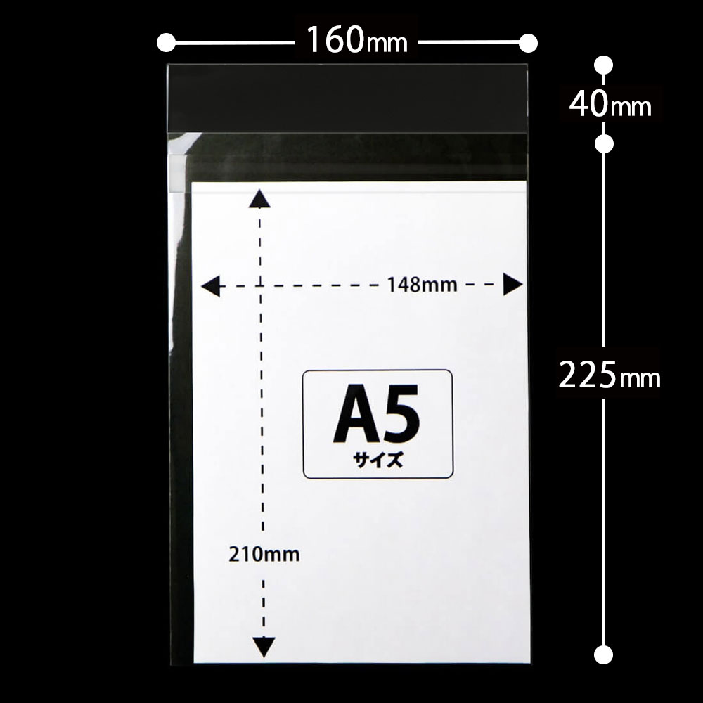 A5用OPP袋本体側開閉自在テープ付の#40厚口タイプです。