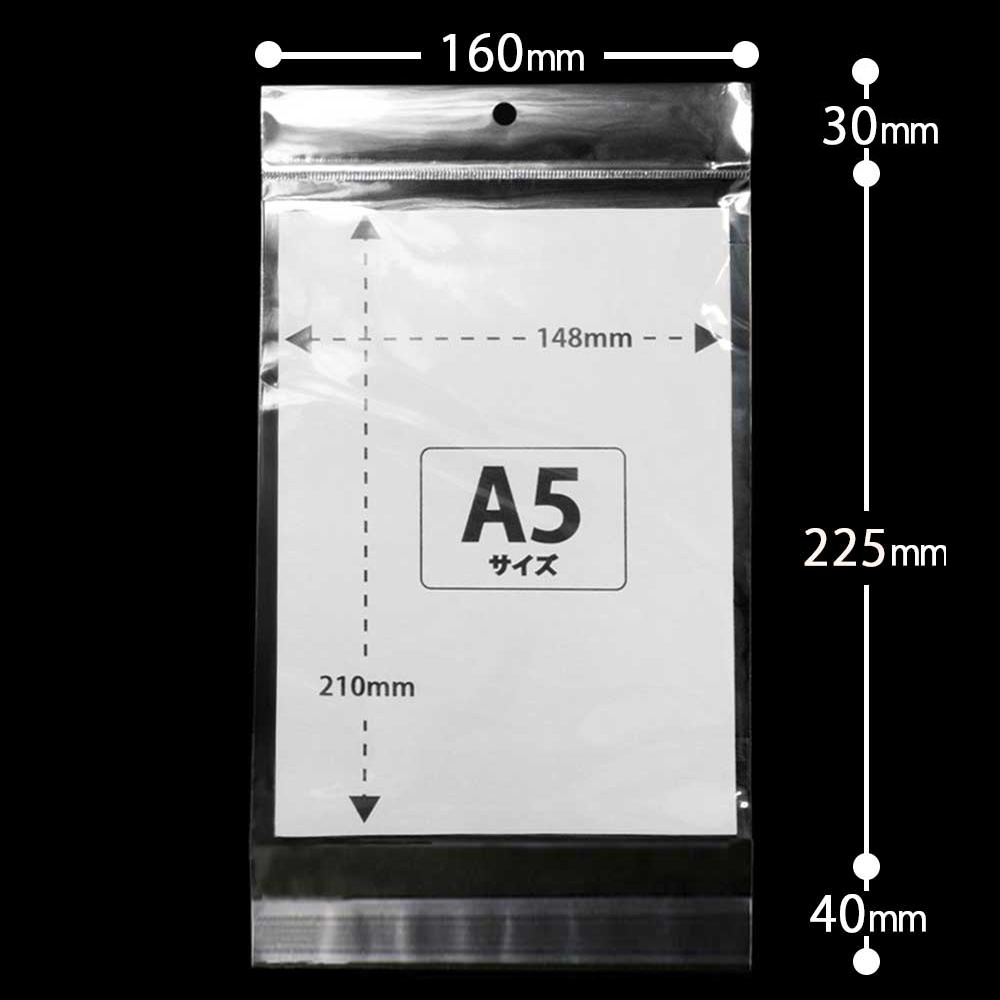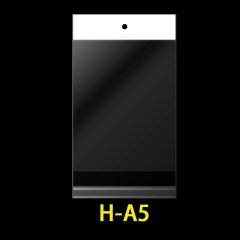 A5サイズ(148x210mm)をフックにひっかけることができる陳列用袋です。