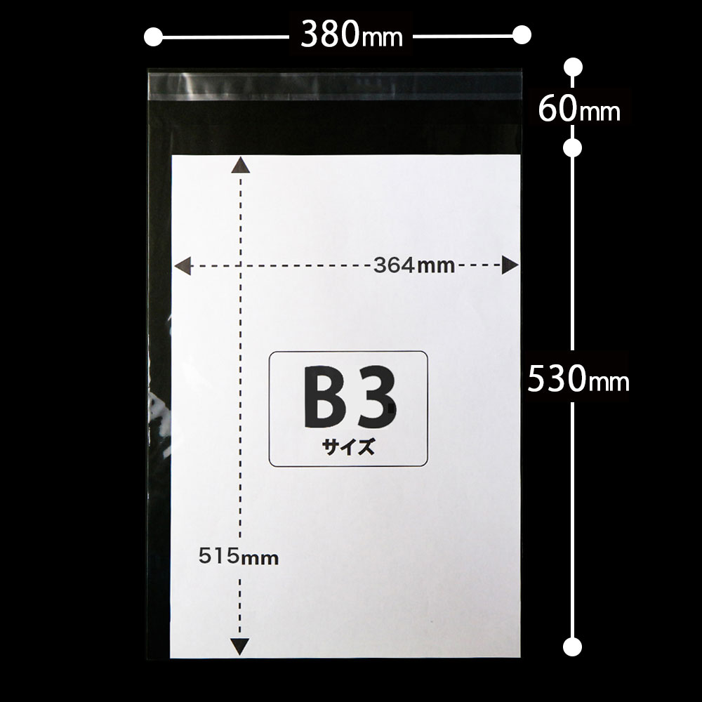 B3サイズのテープ付きOPP袋とは、横380mm×縦530mm+フタ60mmのOPP袋です。