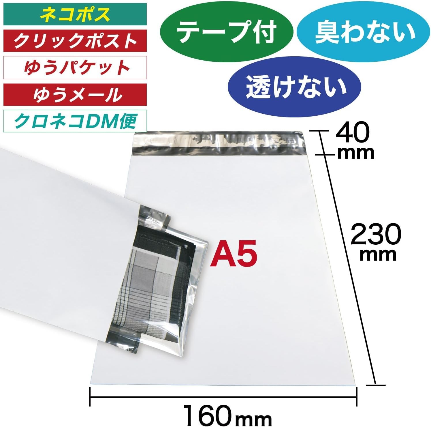 A5サイズ(148x210mm)が収まる宅配ビニール袋(160x230+40mm)です。